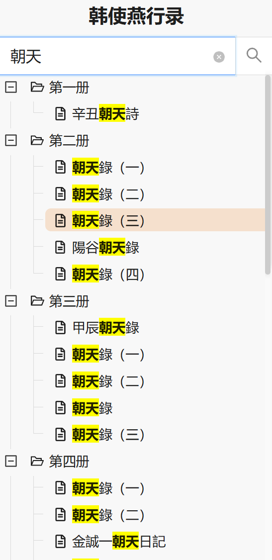在目录上方的搜索框内搜索关键字,下方会将匹配的目录节点高亮显示出来,检索范围为整个目录,